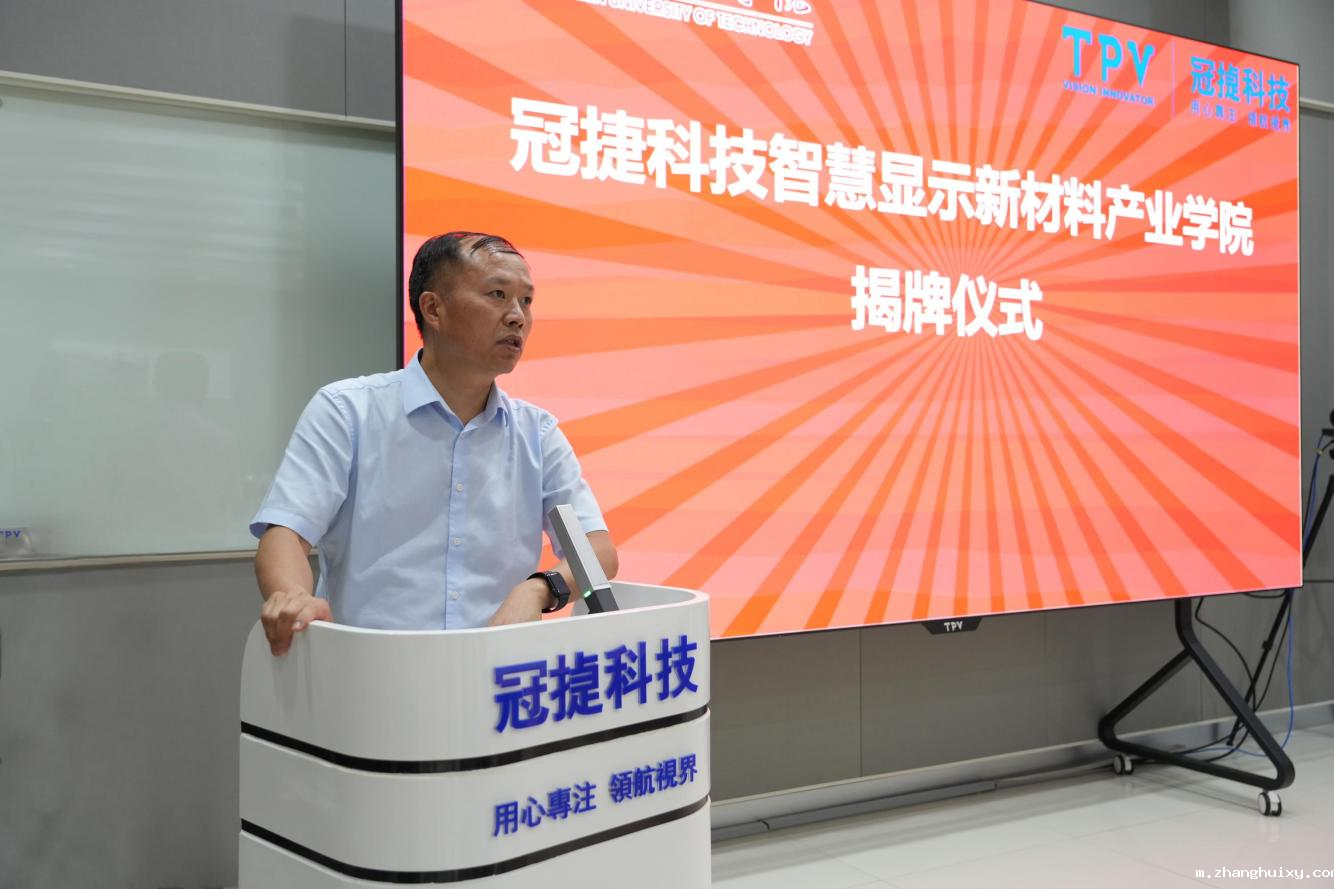 陈小辉校长在致辞中表示,冠捷科技智慧显示新材料产业学院的成立既是学校深化产教融合、提升人才培养质量的重要举措,更是响应国家“制造强国”战略的关键落子。产业学院将通过政产学研协同创新生态圈,精准对接新型显示材料产业升级需求,深度融合政府政策赋能、高校智力引擎与企业工程实践优势,构建“产业链-人才链-创新链”三链融合的发展格局,为国家战略科技力量建设和地方产业振兴注入强劲动能。冠捷科技公司陈培文总经理表示,公司作为行业领军企业,将积极投入资源,与学校共同打造实践教学平台,促进产学研融合,提高科技成果转化率,助力产业升级。