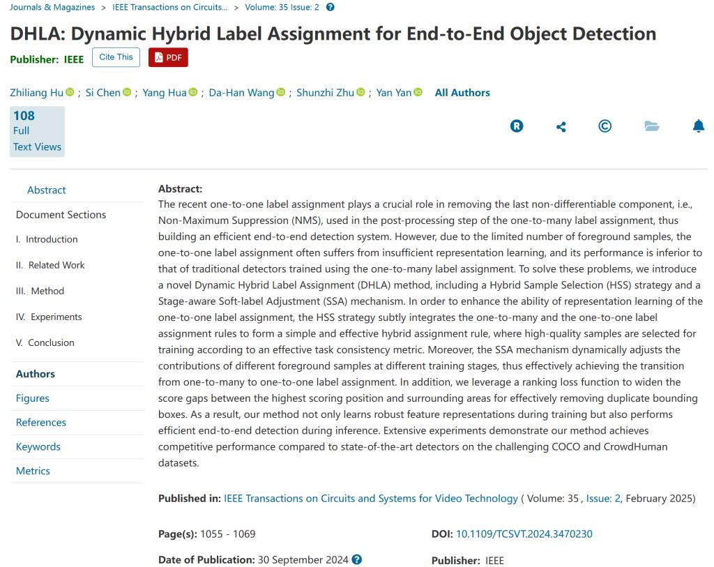 近日,我校计算机与信息工程学院2022级硕士研究生胡志良研究成果论文“DHLA: Dynamic Hybrid Label Assignment for End-to-End Object Detection”(《DHLA:面向端到端目标检测的动态混合标签分配》)发表于计算机视觉领域国际顶尖期刊IEEE Transactions on Circuits and Systems for Video Technology(影响因子:11.1)。该期刊为中国科学院期刊分区1区TOP期刊。胡志良为论文第一作者,我校陈思教授为论文通讯作者。